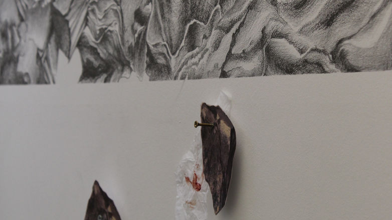 MDF, shale rock, limestone, fossilised coral, blood, projection